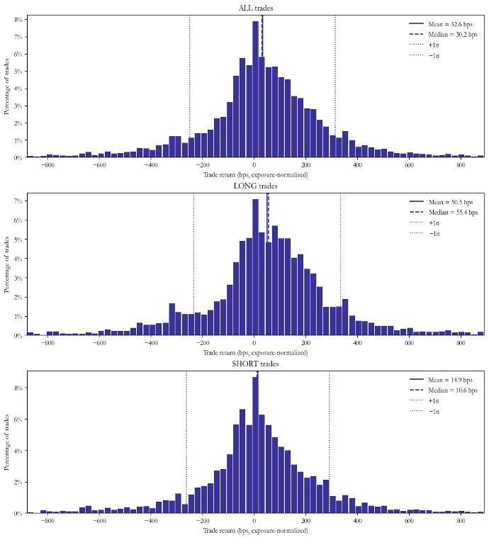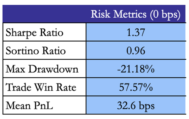 As for trading frequency, the mean holding time is 1.24 days and the strategy averages 2.38 trades per day. This makes sense given the relatively fast reversion speed of the residuals. On the other hand, our win rate and mean PnL is 58% and is 32.6 bps per trade, respectively. Naturally, this reflects decent returns especially considering the number of trades this strategy produces.