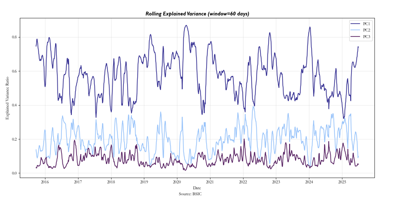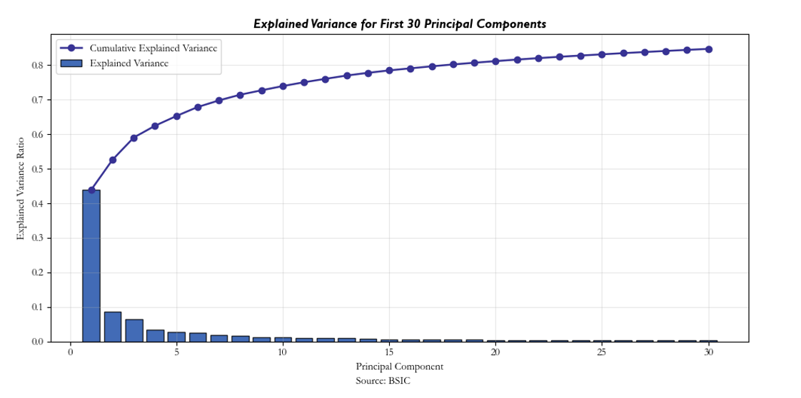 where the first 15 principal components (PC₁ … PC₁₅) explain roughly 80% of the total variance of market returns, in our universe. The eigen-portfolio weights are re-adjusted daily based on a rolling window of n days to capture PCA components (both PCs and each PC’s component) variations.