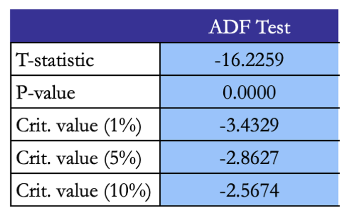 In our universe, The ADF (Augmented Dickey-Fulley) test further supports the implication that residuals are stationary: