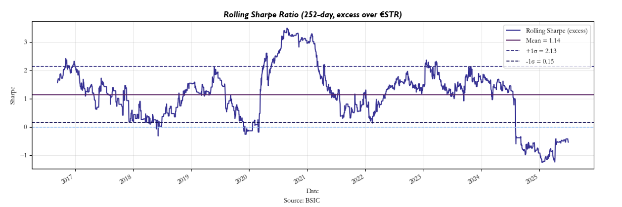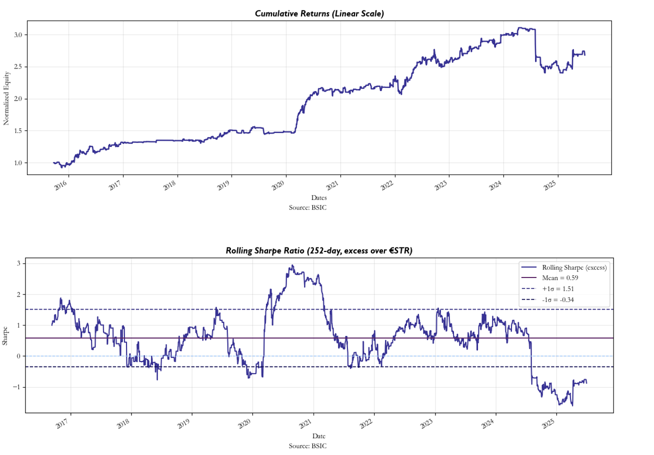 The strategy rationale is that it catches residual inefficiencies in the market. It works quite well for our universe despite the caveats previously mentioned (somewhat unstable PC explanatory power, inefficient hedging of beta). After around 15 principal components, the model no longer explains fundamental or idiosyncratic structure; what’s left are mostly inefficiencies and noise which is exactly why the mean-reversion works. The strategy effectively computes, at time t-1, the return component unexplained by the principal components, which is the “inefficiency.” Since these residuals are stationary, at t > t-1 they statistically tend to revert toward equilibrium, creating a higher win rate in the direction indicated by the signal. However, when systematic returns move significantly due to large regime shifts, the model’s structure breaks down, inefficiencies stop being well defined, and the strategy’s performance becomes random. During stress regimes (2020 COVID crash, 2025 tariffs shock, etc.), factor loadings change and residual decomposition becomes unstable. Thus, the residual signal no longer isolates inefficiency. As a result, residual reverts but asset return is dominated by systematic movement. The “stat-arb” essence becomes “stat-roulette”!