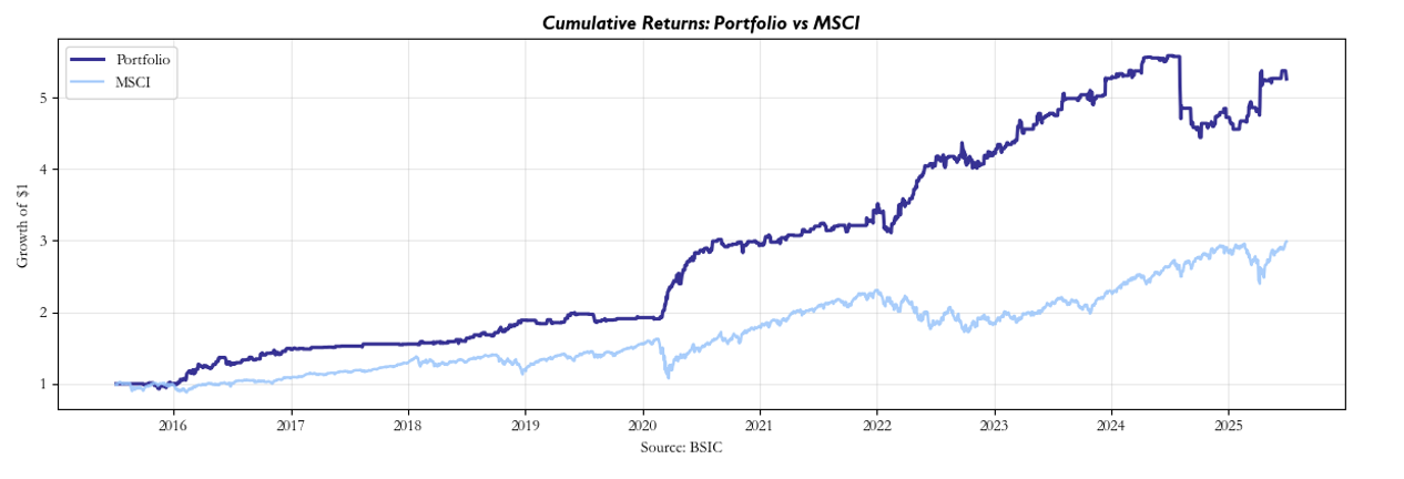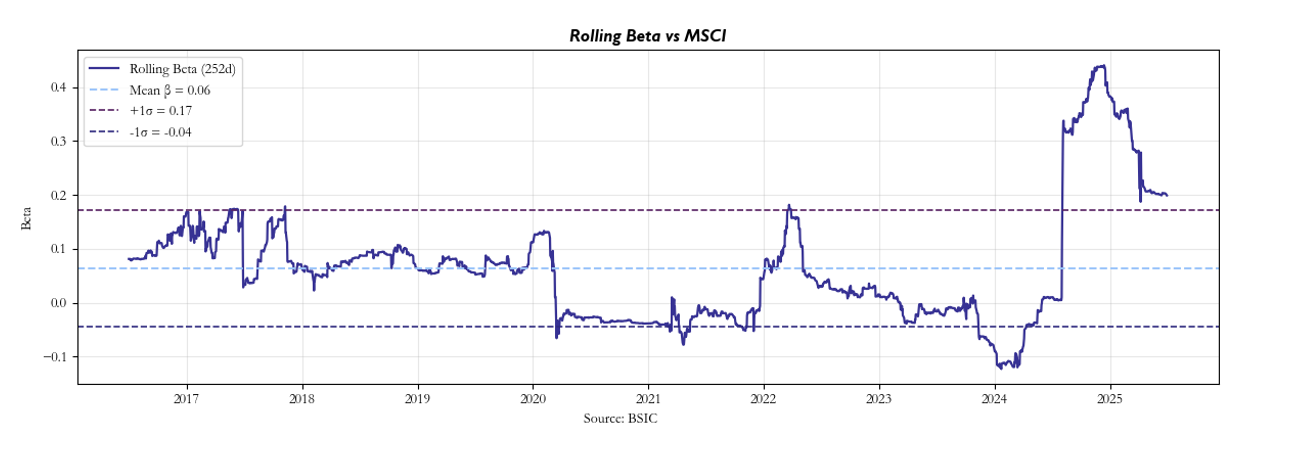 Relative to buy-and-hold MSCI (our chosen benchmark of the universe’s market), it’s clear that our strategy tended to outperform. However, the question naturally becomes: is this just beta, or are these indeed the residuals which dominated the return profile? Our attempt at addressing this issue was to compute the rolling beta, which revealed that throughout the course of the backtest, our returns have been somewhat uncorrelated. It is our view that large changes can primarily be attributed to regime shifts.