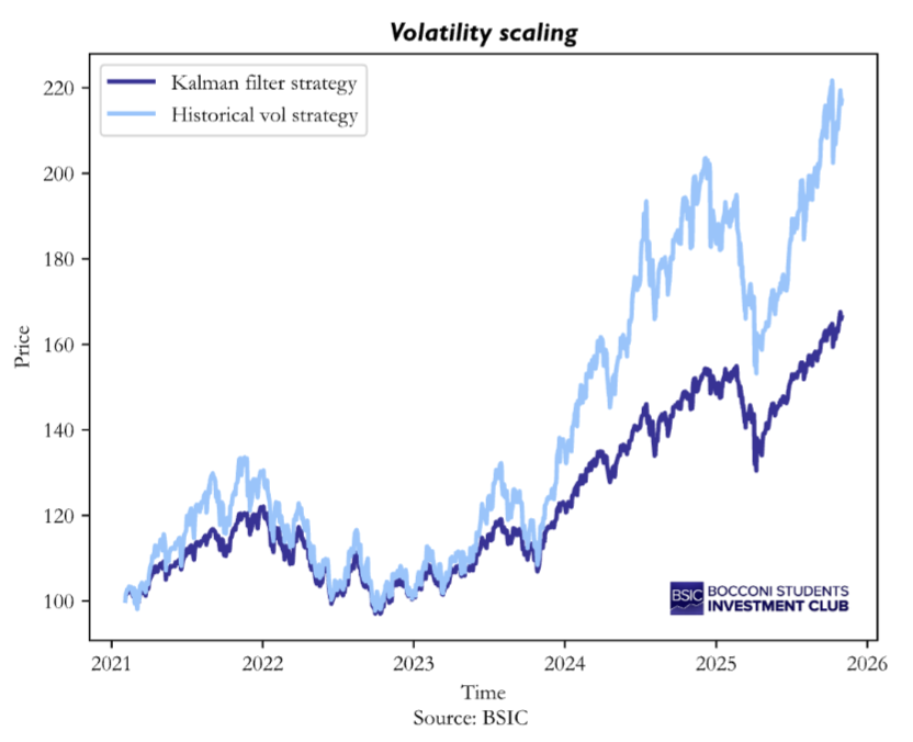 Once the parameters of the volatility process are estimated, we run the Kalman filter to obtain the two quantities of interest: the filtered estimate of current log-volatility, and the one-day-ahead forecast of log-volatility. This forecast represents our forward-looking estimate of risk, which we can use to scale our positions in the index.