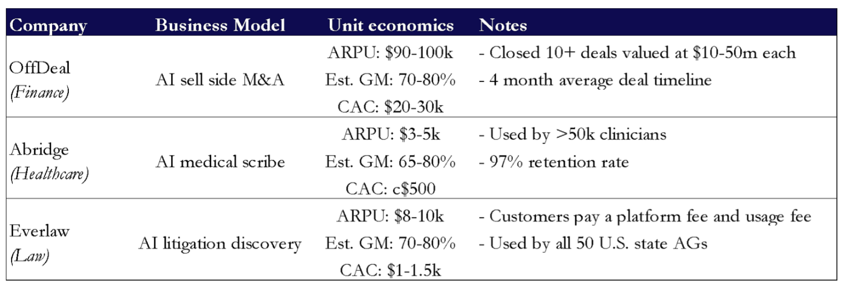 On top of that, these approaches to profitability for OpenAI are quite different from other approaches which today are showing higher margins by AI businesses. The best margins are currently being made in vertical AI SaaS. The first benefit these businesses have over LLM providers is that by focusing on a specific niche, they can leverage industry-specific IP to offer a bespoke service with higher switching costs. Secondly, in areas like finance or law, the productivity benefit is easily measurable (in billable hours), and the traditional cost is high (e.g., a lawyer billing $1000 /hour). This makes the ROI very clear to customers and therefore allows to price those AI SaaS on a value-added basis rather than in competition or cost basis. The third benefit is that, since many contracts are usage based, inference costs are passed on to the customer, which results in high gross margins. For an AI SaaS business, in fact, the LLM provider is an upstream supplier of API calls that wins business by competing on price.