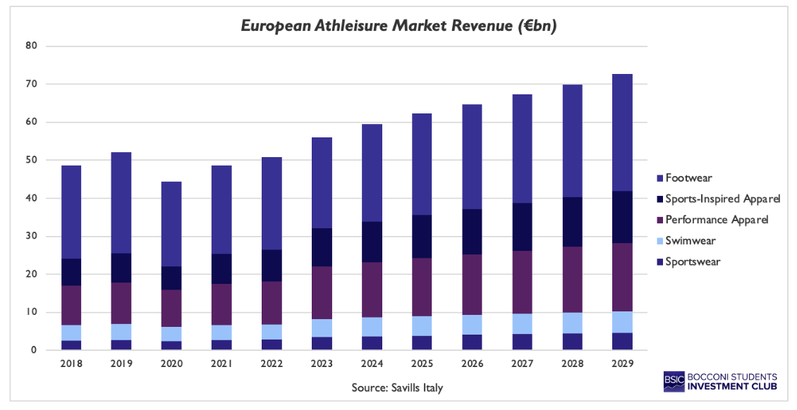 However, these demand drivers do not eliminate the market’s main restraining factors but rather make it more competitive. The expansion of athleisure intensifies competition, and changing trends expose the market to supply chain risks. Since the market is relying heavily on global sourcing and long production timelines, an increasing difficulty arises in responding to sudden demand changes. This is especially relevant in the athleisure market, as product ‘newness’ matters. This market growth is attracting both incumbents and new entrants, causing brands to increasingly compete through performance features, product breadth, and distribution, which pushes for further innovation. As a result, differentiation becomes costly, due to not only requiring investments in fabrics and design, but also in marketing and distribution.
