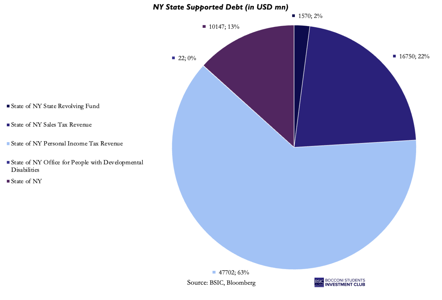 When looking at the debt composition for bonds supported by the state of New York, it stands out that, unlike most other states, New York relies heavily on dedicated tax structures, with the majority funded by personal income tax. While tax increases can often be a supportive factor for bond prices, in this case they are likely to be used either to finance new spending or to address fiscal challenges stemming from the Trump administration. Moreover, increasing income taxes could further concentrate the state’s revenue sources, reducing diversification and leaving bond payments more exposed to volatile financial markets and broader economic conditions, potentially worrying investors.