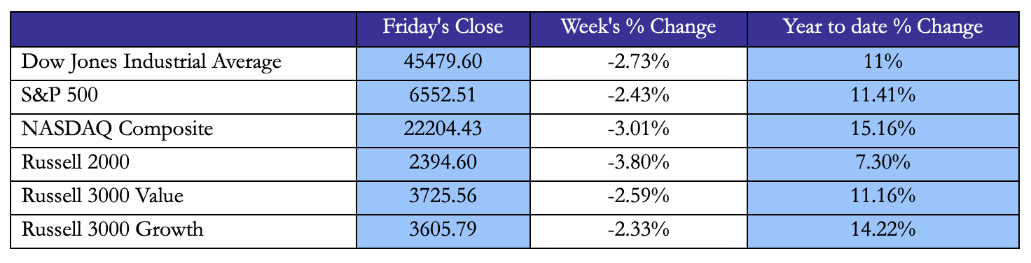 U.S. equities ended the week notably lower, marking a pause in the recent upward momentum. The S&P 500, Nasdaq Composite, and Dow Jones Industrial Average fell by approximately -2.43%, -3.01%, and -2.73%, respectively, logging only the third weekly decline in the past ten weeks. The market had been on track for modest gains until Friday, when a sharp sell-off triggered by renewed U.S. – China trade tensions reversed the week’s trajectory. President Trump announced that he was considering additional tariffs on Chinese imports and canceled a planned meeting with China’s leader, citing Beijing’s newly imposed restrictions on rare earth mineral exports. This escalation reignited investor concerns about the global supply chain and trade stability, prompting a broad-based decline across sectors. Despite the setback, the pullback follows a period of sustained gains, suggesting investors are recalibrating risk amid persistent geopolitical uncertainty.