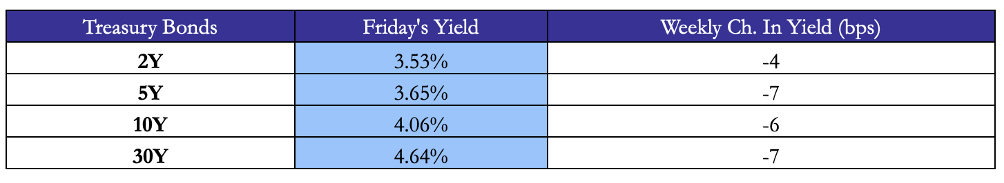 U.S. Treasury yields fluctuated throughout the week before ending broadly lower, as investors digested the Federal Reserve’s latest meeting minutes and the ongoing government shutdown. The 2-year Treasury yield declined to around 3.53%, its lowest level in nearly three weeks, reflecting stronger expectations for continued monetary easing into the year-end. Meanwhile, the 10-year yield edged down to 4.06%, and the 30-year held steady near 4.64%, producing a slight steepening of the yield curve. The combination of softer risk sentiment and reduced data flow has reinforced demand for longer-term Treasuries, while short-term rates continued to reflect dovish Fed bets.