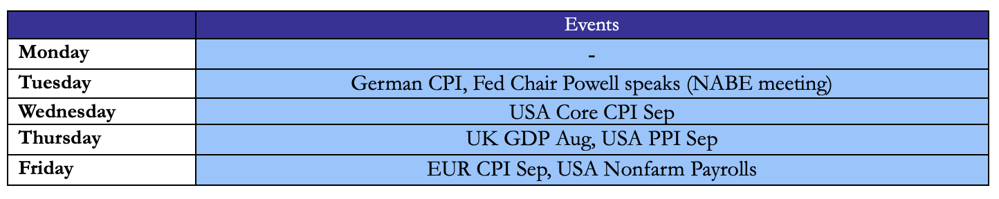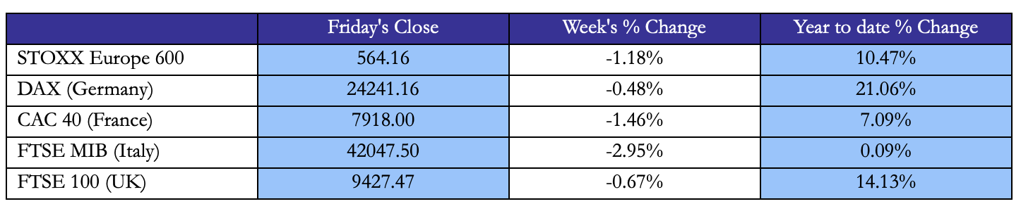 European equities pulled back this week, ending their strong run as renewed global trade tensions and weaker risk appetite weighed on sentiment. The EuroStoxx 600 slipped 1.18%, marking its first weekly decline in three weeks. Most major national indices followed suit: Germany’s DAX 40 fell 0.48%, France’s CAC 40 lost 1.46%, and Italy’s FTSE MIB dropped 2.95%, its sharpest weekly decline since August. The Netherlands’ AEX also weakened (–2.2%), while Spain’s IBEX 35 posted a more moderate -0.7% loss. The selling was broad-based, with healthcare and technology lagging after recent outperformance, and energy stocks retreating amid softer oil prices and lower global demand expectations. In France, political uncertainty added to the cautious tone after Prime Minister Sébastien Lecornu tendered his resignation earlier in the week, only to be reappointed by President Macron amid efforts to preserve government stability and push forward the upcoming budget.