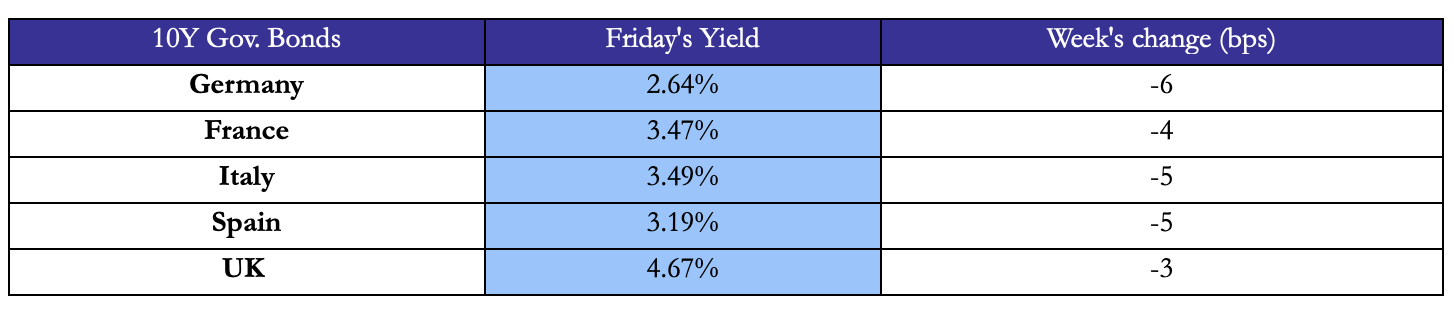 European government bond yields were little changed this week, reflecting a generally cautious tone across fixed-income markets. The German 10-year Bund yield slipped by 6 bps to 2.64%, while France’s OAT edged down to 3.47% and Italy’s BTP eased slightly to 3.49%, narrowing the Italy–Germany spread to roughly 85 bps. The moves came amid a lack of major economic surprises and modest safe-haven demand following the mid-week equity sell-off. In the UK, the 10-year gilt yield ended virtually flat at 4.67%, with investors weighing persistent inflation against softening growth indicators. Elsewhere, Switzerland’s 10-year yield held at 0.25%, underscoring subdued inflation expectations, while Turkey’s government bond yield rose sharply to 31.2%, reflecting local monetary tightening and ongoing inflation concerns. Overall, the stability in core European yields suggests that markets continue to anticipate a prolonged pause from the ECB as inflation moderates and growth momentum cools.