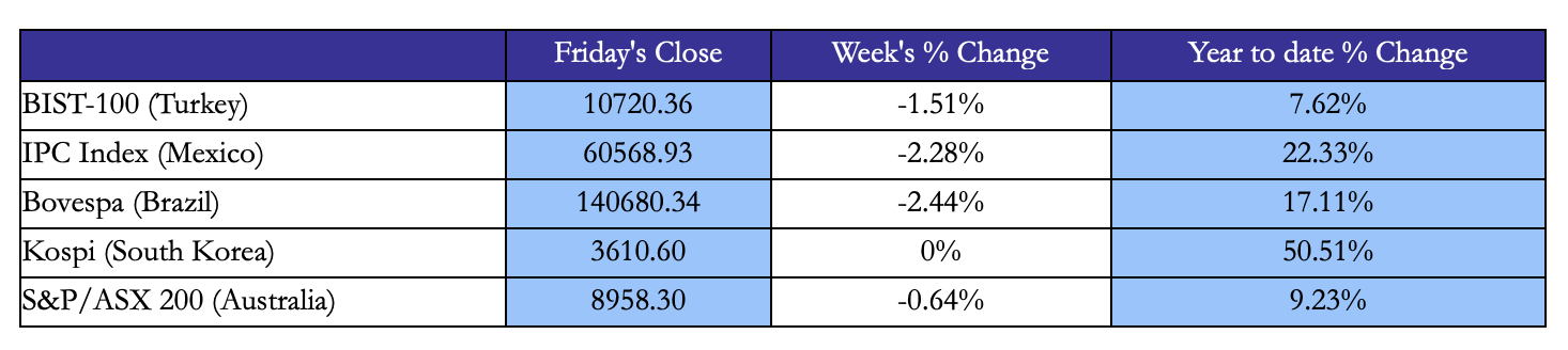 Elsewhere in Asia, performance was more muted. China’s major indices declined as trade tensions with the U.S. weighed on sentiment: the CSI 300 fell 0.97% , while the Shanghai Composite market was closed for holidays. Hong Kong’s Hang Seng Index also retreated 3.42%, reversing prior gains as technology and property shares slipped. India’s Sensex gained 1.6%, supported by banking and industrial stocks, while Taiwan and South Korea were little changed. Regional bond yields remained largely stable, with Japan’s 10-year government bond yield holding near 1.70% and China’s 10-year yield at 1.86%, as markets await signals from central banks on the pace of further normalization.