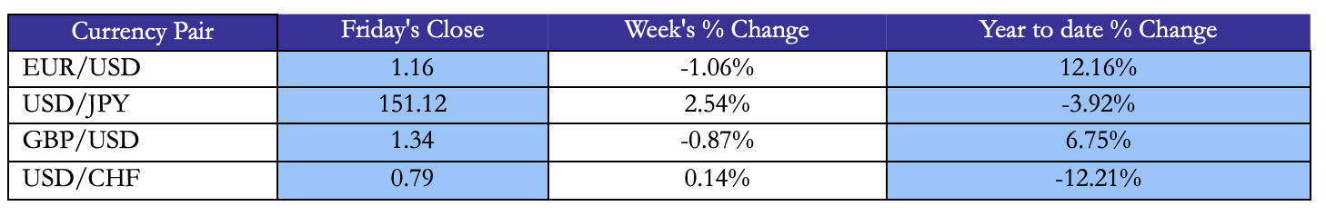 The U.S. dollar regained strength this week, with the Dollar Index (DXY) climbing +1.3% to around 98.9, supported by safe-haven demand following renewed geopolitical and trade tensions. The euro slipped 1.06% to $1.16, while the British pound eased 0.87% to $1.34, weighed by lingering fiscal uncertainty and weaker UK growth indicators. The Japanese yen depreciated 2.54% to roughly ¥151.12 per dollar, as investors unwound early-week bets on a Bank of Japan rate hike amid political turbulence in Tokyo. Meanwhile, commodity-linked currencies underperformed, with the Australian dollar (-2.0%) and New Zealand dollar (-1.8%) hit by softer Chinese demand data. In emerging markets, the picture was mixed: Brazil’s real strengthened 3.5% on optimism around fiscal reforms, while Turkey’s lira gained nearly 1%, extending its strong year-to-date appreciation above +18%.