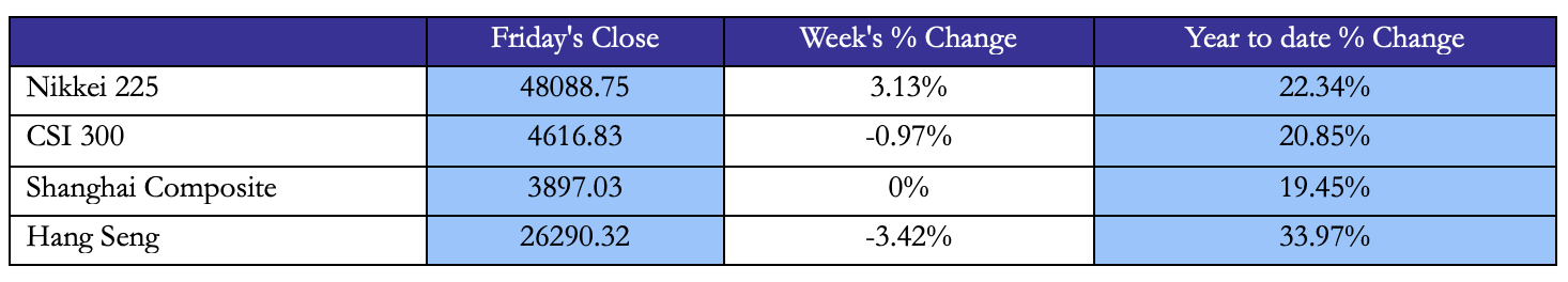 Asian markets traded with a mixed tone this week, though Japan once again dominated headlines. The Nikkei 225 surged nearly 5% on Monday to a new record high before paring gains later in the week, finishing up 3.13% overall. The rally was initially fueled by optimism following a leadership change within Japan’s ruling Liberal Democratic Party, which investors viewed as supportive of pro-growth and reformist policies. However, sentiment cooled after one of the LDP’s key coalition partners withdrew its alliance, casting uncertainty over whether Sanae Takaichi would secure the premiership. Despite the political turbulence, Japan’s equity performance remains underpinned by robust corporate earnings and continued foreign inflows, aided by a still-weak yen and improving business confidence.