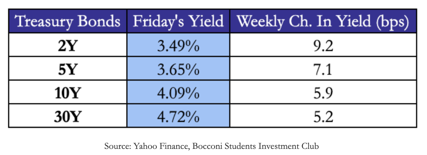 US Treasury yields moved higher across the curve during the week, with short maturities leading the advance. The 2-year yield rose 9.25 bps to 3.491%, the 5-year increased 7 bps to 3.652%, the 10-year gained nearly 6 bps to 4.085%, and the 30-year climbed 5.23 bps to 4.722%, resulting in a flattening of the yield curve. The more pronounced move at the front end followed Wednesday’s FOMC meeting, which prompted a modest repricing of near-term rate expectations. While longer maturities retraced slightly after the announcement, the overall weekly dynamic reflected a shift in expectations primarily concentrated at the front end.