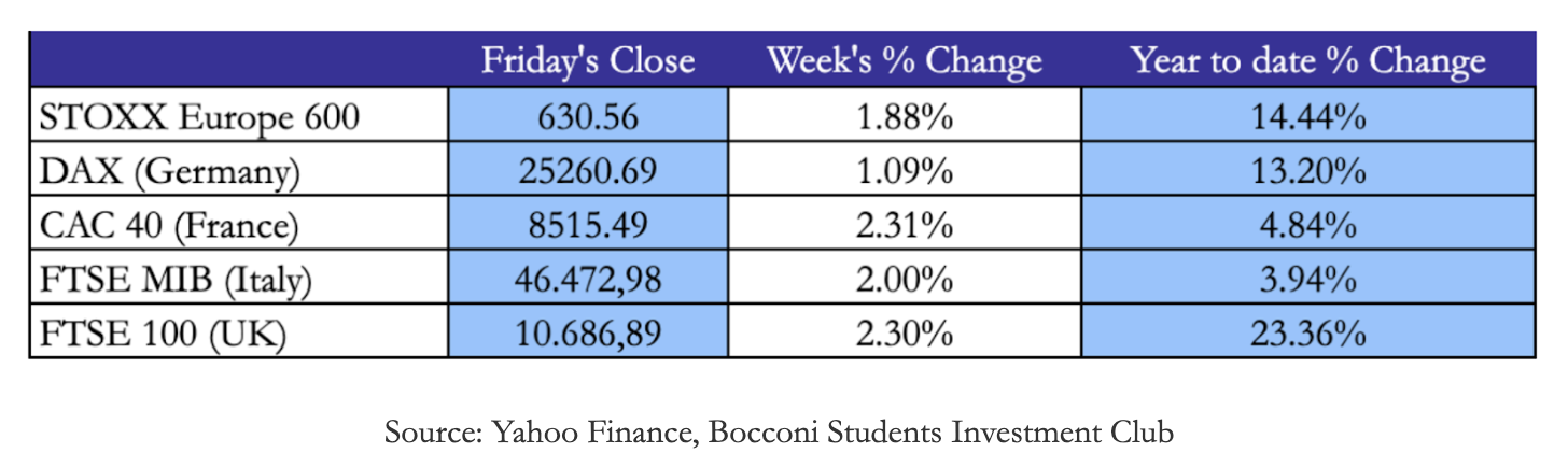 European equities closed the week higher, with broad-based gains across major benchmarks. It was another busy day of earnings on Thursday with Airbus, Nestle, Rio Tinto, Zurich Insurance, and Renault among the European companies reporting. Airbus shares dropped about 7% after it said that it expects to deliver 10 commercial aircraft less than expected. The STOXX Europe 600 advanced 1.88% on the week to a record high, bringing its year-to-date performance to +14.44%. Germany’s DAX rose 1.09%, maintaining solid momentum with a +13.20% gain since the start of the year. France’s CAC 40 outperformed on a weekly basis, climbing 2.31%, though its year-to-date increase remains more modest at +4.84%. In Italy, the FTSE MIB gained 2.00% during the week but the index was very volatile with the last day accounting for 1.50% of the growth. The UK market also delivered strong results, as the FTSE 100 rose 2.30% over the week and stands out with a robust +23.36% year-to-date return, the strongest performance among the major European indices listed. Overall, European markets continue to demonstrate resilience, with the UK leading year-to-date gains while Italy remains comparatively more volatile.