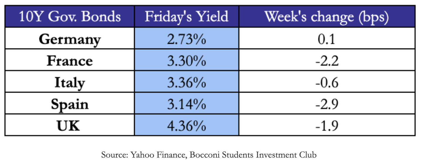 European sovereign bond markets were broadly mixed over the week, with peripheral yields easing while core markets remained relatively stable. Germany’s 10-year Bund yield edged marginally higher to 2.73%, posting a modest weekly increase of 0.1 bps, suggesting limited repricing in core euro-area rates. In contrast, France and Italy saw yields decline, with the French 10-year OAT falling 2.2 bps to 3.30%, and Italy’s 10-year BTP easing 0.6 bps to 3.36%, despite being very volatile during the week. Spain outperformed among peripherals, as its 10-year yield declined 2.9 bps to 3.14%, reflecting improving investor appetite for higher-yielding euro-area debt. In the UK, the 10-year gilt yield moved lower by 1.9 bps to 4.36%, indicating a slight pullback in rate expectations amid ongoing assessment of the Bank of England’s policy outlook. Overall, the modest compression in peripheral spreads versus Germany suggests continued confidence in euro-area fiscal stability, while Bund yields remained anchored due to the ongoing fiscal policy.