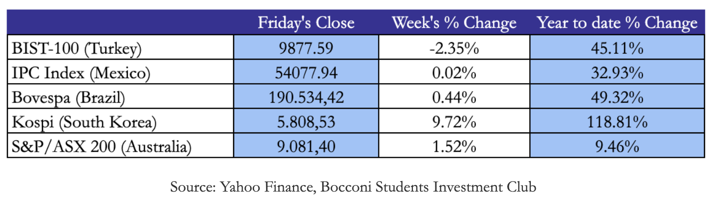 Emerging markets delivered a broadly positive performance this week, led by strong gains in Asia. South Korea’s Kospi surged 9.72%, extending its year-to-date return to an exceptional 118.81%, making it one of the strongest-performing indices globally. Australia’s S&P/ASX 200 also advanced 1.52%, bringing its year-to-date gain to 9.46%. In Latin America, performance was more moderate. Brazil’s Bovespa edged higher by 0.44%, while maintaining a robust +49.32% year-to-date return. Mexico’s IPC Index remained broadly stable, rising 0.02% over the week and posting a +32.93% gain since the start of the year. In contrast, Turkey’s BIST-100 declined 2.35%, though it remains up 45.11% year-to-date. Overall, emerging markets continue to exhibit strong year-to-date momentum, with dispersion across regions reflecting differing domestic macro and policy dynamics.