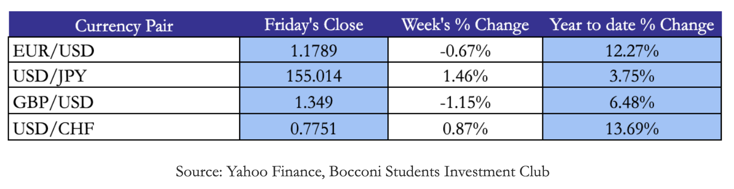 Currency markets saw more pronounced moves this week, with the US dollar strengthening against some of the major counterparts. The EUR/USD declined 0.67% to 1.1789, trimming its year-to-date gain to 12.27%. Similarly, the GBP/USD fell 1.15% to 1.349, while remaining up 6.48% since the start of the year. In contrast, the dollar advanced against the Japanese yen, with USD/JPY rising 1.46% to 155.014, extending its year-to-date increase to 3.75%. The greenback also gained against the Swiss franc, as USD/CHF climbed 0.87% to 0.7751, pushing its year-to-date performance to +13.69%. Overall, the weekly price action suggests renewed dollar strength after the weakening pressure of the previous period, likely reflecting shifting rate expectations and relative growth dynamics, even as broader year-to-date trends remain mixed across major currency pairs.