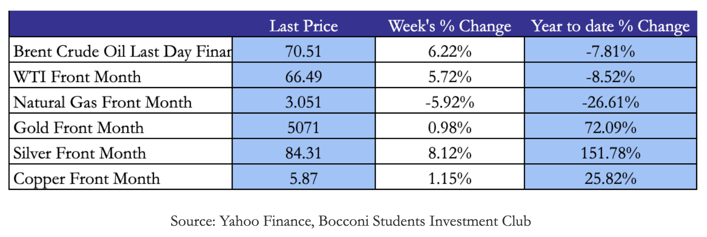 Markets delivered a broadly positive performance this week, led by strength in energy and precious metals. The momentum was further reinforced by increasing geopolitical tensions with Iran. Brent crude advanced 6.22% to $70.51, while WTI gained 5.72% to $66.49, partially recovering from earlier year-to-date declines (−7.81% and −8.52%, respectively). The rebound suggests renewed optimism in the energy complex following recent price weakness. Natural gas, however, moved in the opposite direction, falling 5.92% to $3.051 and extending its year-to-date decline to −26.61%, reflecting softer demand dynamics and ongoing supply pressures. Precious metals remained firmly supported. Gold rose 0.98% to $5,071, lifting its year-to-date performance to +72.09%. Silver outperformed markedly, surging 8.12% on the week to $84.31 and extending its year-to-date gain to an impressive +151.78%, underscoring strong investor positioning in the broader metals complex. Meanwhile, copper climbed 1.15% to $5.87, maintaining a solid +25.82% year-to-date increase, supported by expectations of resilient industrial demand despite persistent global growth concerns.