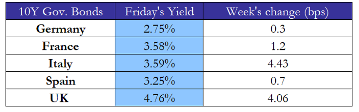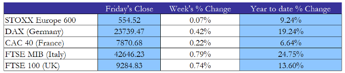 European markets showed signs of resilience this week. Though markets began on weaker note, the STOXX Europe 600 index ended the week basically flat, up just 0.07% at 554.52. On Friday, shares rebounded from three-week lows, with financials and industrials leading gains while healthcare stocks underperformed.