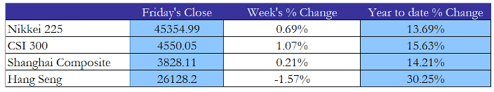 Asian markets delivered a mixed performance, with Japan standing out for both weekly gains and sharp sector swings. The Nikkei 225 advanced nearly 0.9% for the week, closing at 45,355, but dropped 0.87% on Friday, snapping a three-day rally as stronger-than-expected U.S. data lowered hopes for further cuts and President Trump’s new tariffs weighed on investor sentiment. Domestically, Tokyo’s core inflation held at 2.5% in September, undershooting forecasts of 2.8%, while minutes from the Bank of Japan’s July meeting suggested policymakers remain open to tightening further if growth and prices evolve as expected.
