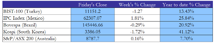 Elsewhere, Brazil’s Ibovespa fell about 0.3% on the week, weighed down by fiscal worries and global rates outlook, whilst Turkey’s BIST 100 fell about 1.3%, giving back some of its recent gains, due to inflation worries and political uncertainty.