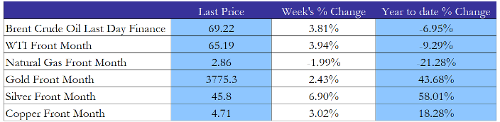 Commodities painted a contrasting picture, with both oil and precious metals prices raising significantly. Brent crude prices rose towards $70 per barrel, while WTI hovered near $65, with both benchmarks achieving their strongest weekly gains in about three months thanks to Russian supply cuts and U.S. inventory drawdowns. The rebound supported energy exporters and commodity-linked currencies.