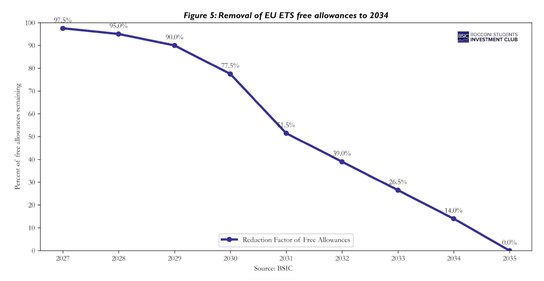 However, the futures curve for EUAs provides insight into expectations. As of 2025, the futures curve is in a slight contango, reflecting carrying costs and perhaps anticipated tightening. Five-year forward EUA prices are notably higher than current, in 2023, 5-year forwards were around €105, implying that by the late 2020s the market expects significantly higher prices. Professional forecasts align with this: for example, Bloomberg New Energy Finance projects the EUA price could reach €145 by 2030 and €175 by 2036 under its base case. Such expectations are driven by the knowledge that the cap will keep shrinking and no major alternative to decarbonization is available in Phase 4. If innovations like hydrogen scale up massively, they could dampen prices by reducing emissions, but those are likely post-2030 impacts. In the medium term, many analysts foresee a structural supply crunch around 2026-2030: once the REPowerEU program stops injecting extra allowances in 2026, and as the linear reduction bites, the net supply will drop sharply. Some market participants are already positioning for this by purchasing allowances now in anticipation of a steep rally in the later 2020s.