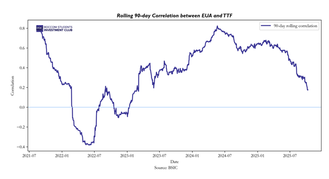 Furthermore, energy prices and fuel switching dynamics as noted, has a strong correlation with natural gas prices in the short term. When gas is cheap, it displaces coal and reduces CO2, easing EUA demand.