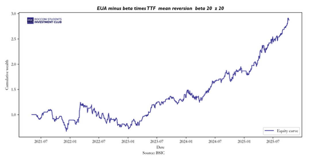 Taken together, these statistics depict a short horizon, high volatility strategy that performs well during periods of stable correlation between carbon and gas prices yet suffers during regime shifts. In academic terms, the results confirm that the spread between EUA and TTF exhibits temporary dislocations that can be exploited, although the associated risk of non stationarity remains significant and calls for additional robustness measures such as volatility scaling, longer estimation windows, or explicit regime filtering.