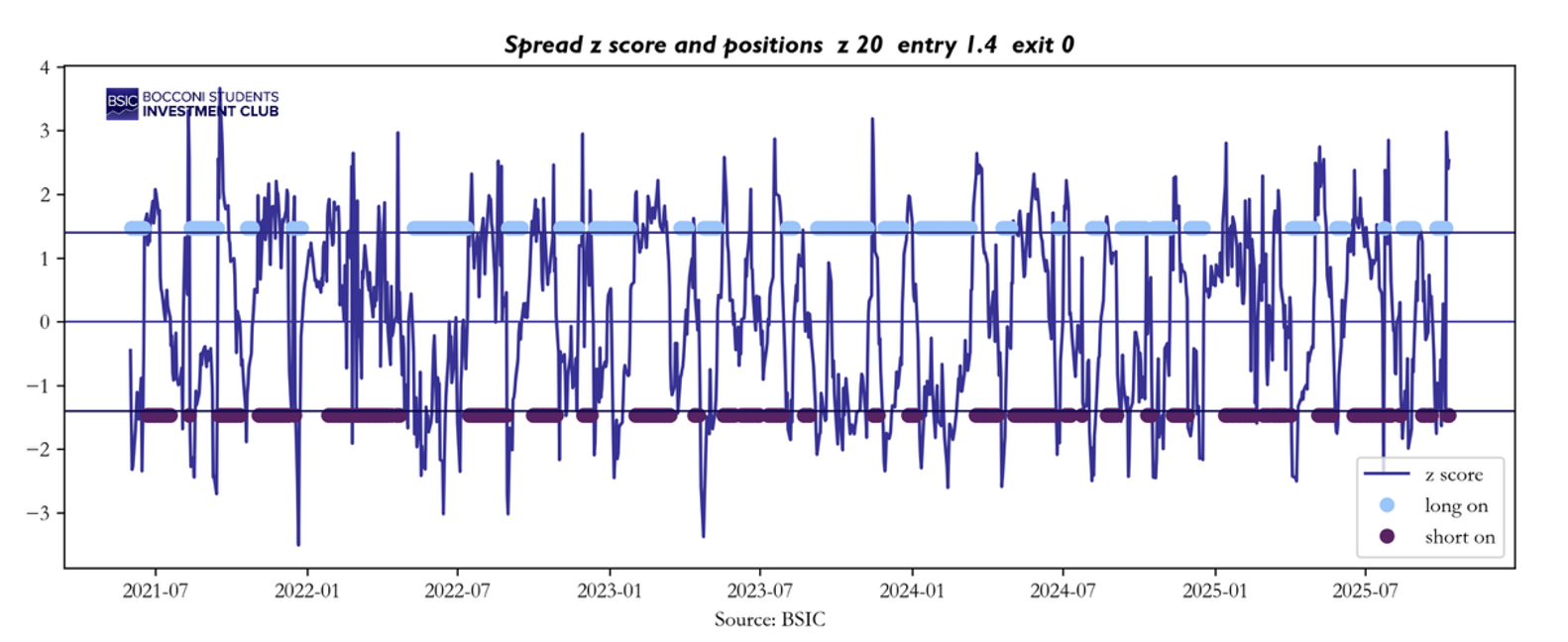 where P denotes the settlement level. Positive St indicates EUA is “rich” relative to TTF under the current hedge; negative St indicates “cheap.” We standardize the spread with a 20 day rolling mean and standard deviation: