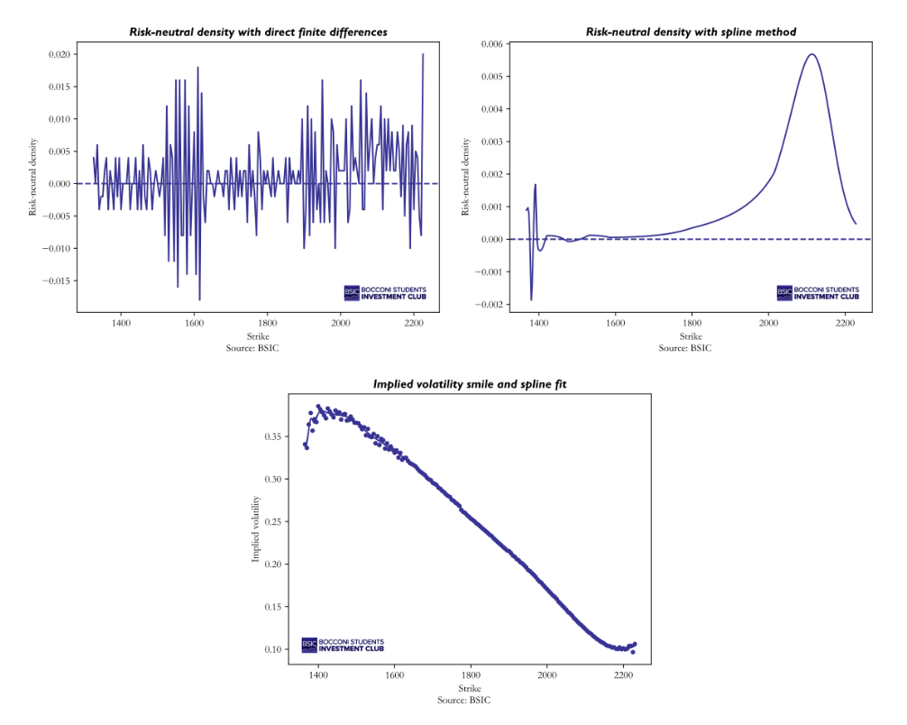 In this article, we show how to extract the risk-neutral density from option prices using Breeden–Litzenberger (1978) result [1], which links the second derivative of call prices with respect to strike to the probability density of the future asset price.