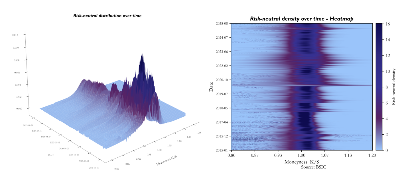Having validated the procedure on a single surface, we extend it systematically across the full dataset, which spans 2,681 trading days from January 2015 to August 2025. For each date, we select the expiry closest to 30 calendar days ahead, as it ensures a consistent horizon across time while keeping the density well-identified by a sufficient number of liquid strikes. We then apply the spline-based Breeden–Litzenberger procedure described above and record the full density