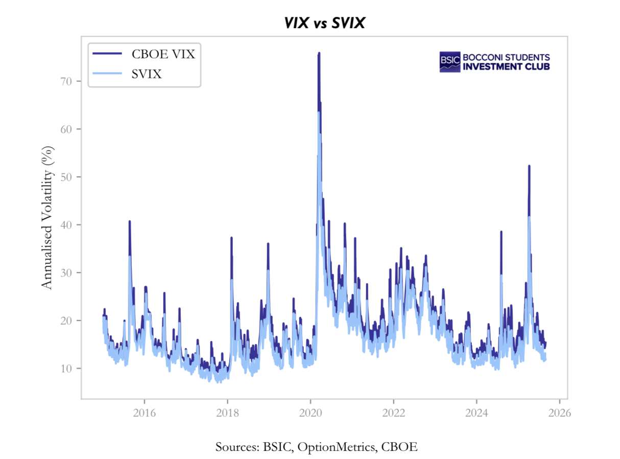 This difference matters for interpretation. The spread VIX² minus SVIX² measures the portion of implied volatility associated with asymmetry and tail thickness, while the ratio SVIX/VIX indicates how much of total implied volatility reflects broad variance rather than tail-specific fear. In stress episodes the spread widens and the ratio falls; in calm periods the opposite tends to happen.