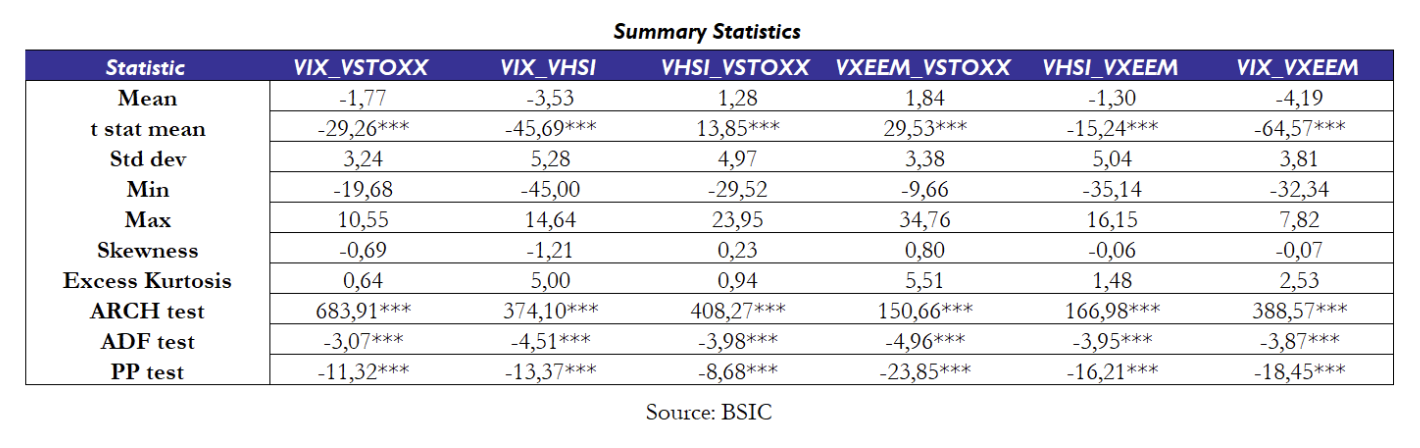 These indexes reflect their local market conditions; however, their movements are often interconnected, as demonstrated by their correlation coefficients, which range from 65% for the VSTOXX-VHSI pair to 86% for the VIX-VSTOXX pair. In this article, we extend previous analysis on volatility futures by Stanescu and Tunaru (2013), by examining the statistical properties of the spreads between the 4 volatility indexes, with the spreads being defined as a simple difference between the prices of indexes’ futures. Using statistical tests and GARCH modeling, we assess whether these spreads exhibit mean-reversion and whether volatility clustering can be exploited to predict the evolution of the spreads. The main idea is to apply autoregressive and conditional variance models to capture the mean and the volatility dynamics of the spreads, following the methodology of Stanescu and Tunaru (2013). The goal is to evaluate whether the statistical features of these spreads can justify a systematic trading strategy.