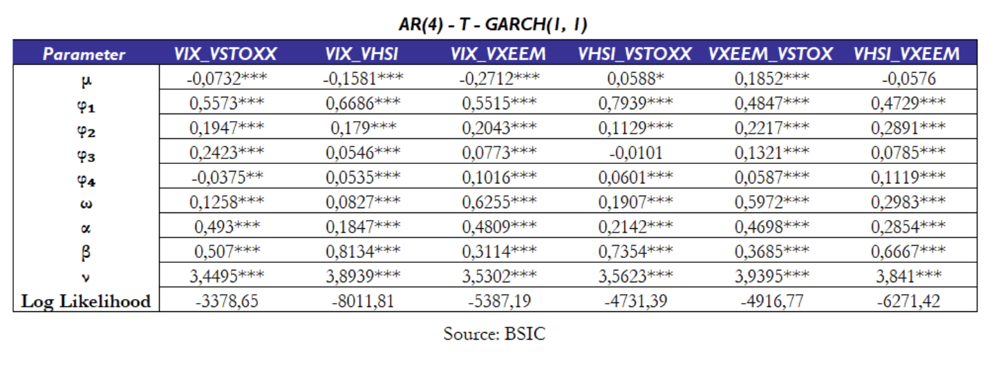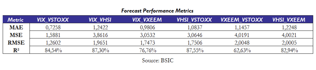 Overall, the AR(4)-GARCH(1, 1) model delivers strong out-of-sample forecasting performance, across all volatility spreads. As shown in the figures, the predictions closely track the actual spreads. From a quantitative point of view, forecast errors, captured by Mean Average Error (MAE), Mean Squared Error (MSE), and Root Mean Squared Error (RMSE) remain low and the explanatory power (R2) of the model is high. In particular, the table show very promising out-of-sample results for VIX_VSTOXX, VIX_VHSI, VHSI_VSTOXX and VHSI_VXEEM, while the worst performing spread is the VXEEM_VSTOXX pair, which show a low R2 (62.63%) compared to the other pairs.