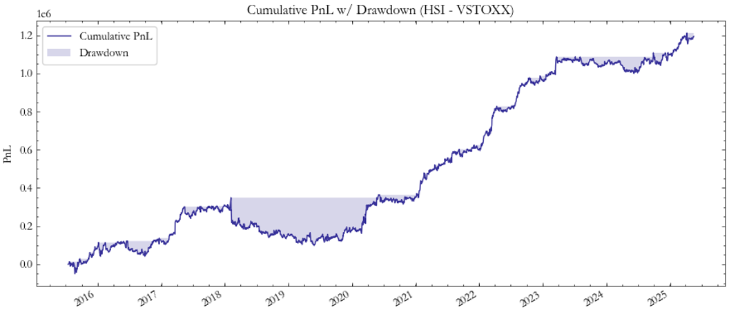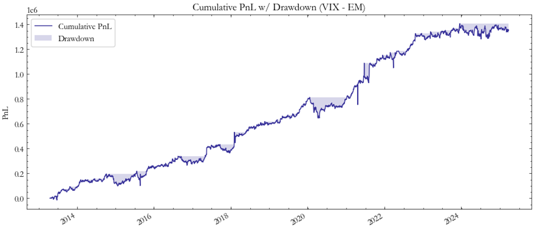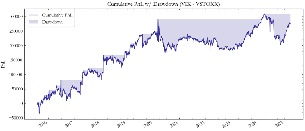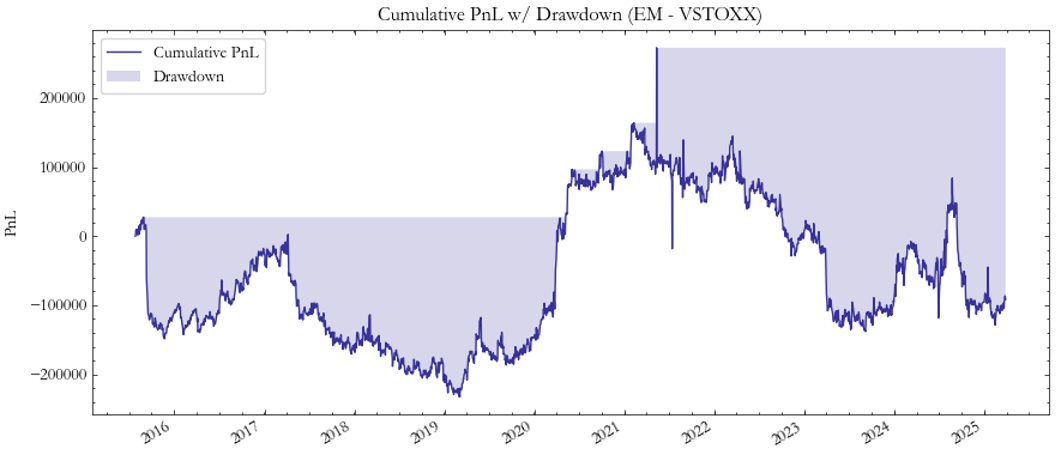 The out-of-sample backtest confirms that the model provides consistent, risk-adjusted performance across our vol index pairs. Starting with emerging market exposures, the VXEEM–VSTOXX pair (Fig. 1–2) delivered highly unstable performance with deep drawdowns and a negative cumulative PnL.