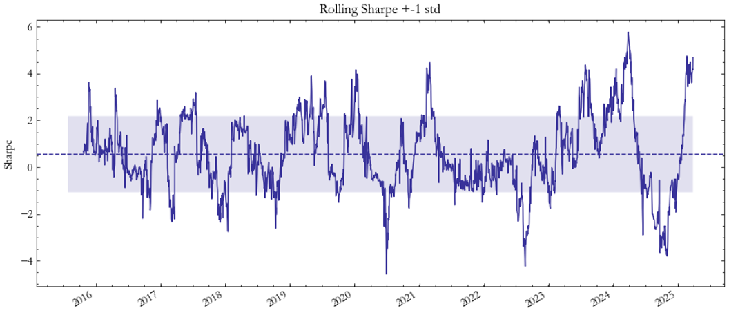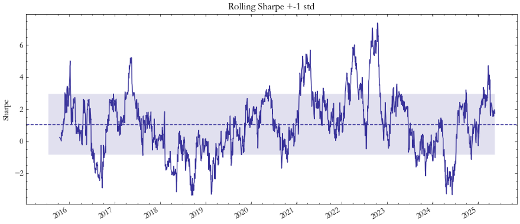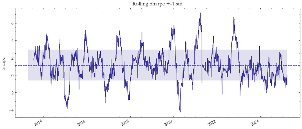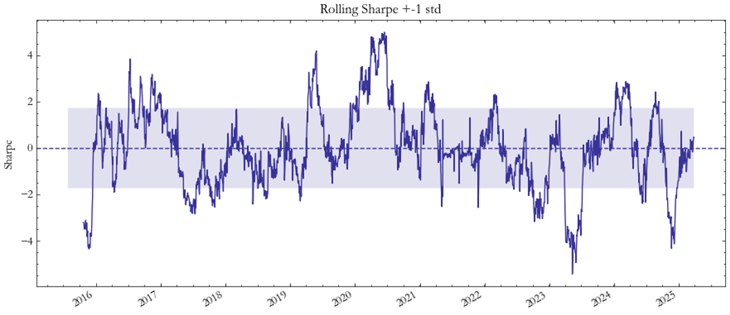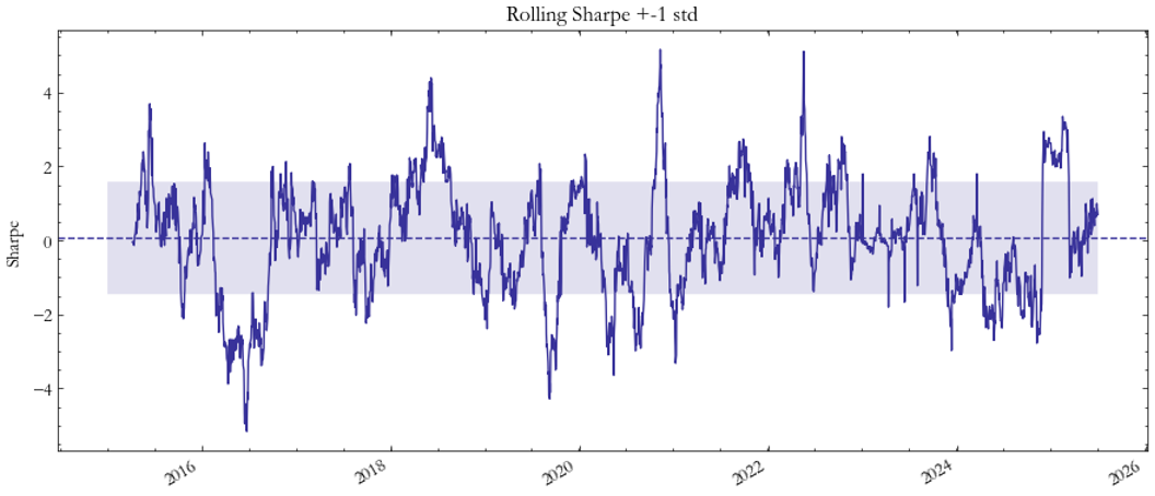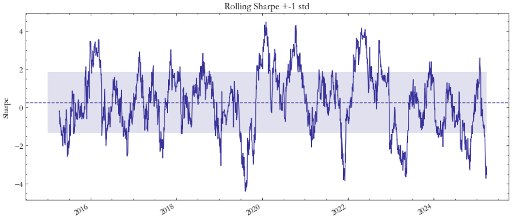 The VIX–VSTOXX spread (Fig. 11–12) serves as a benchmark, replicating findings from Stanescu and Tunaru (2013). As shown in Fig. 11, cumulative PnL is positive and persistent, while Fig. 12 reveals a stable Sharpe ratio near 0.55, matching expectations for a well-behaved, low-beta volatility-spread trade.