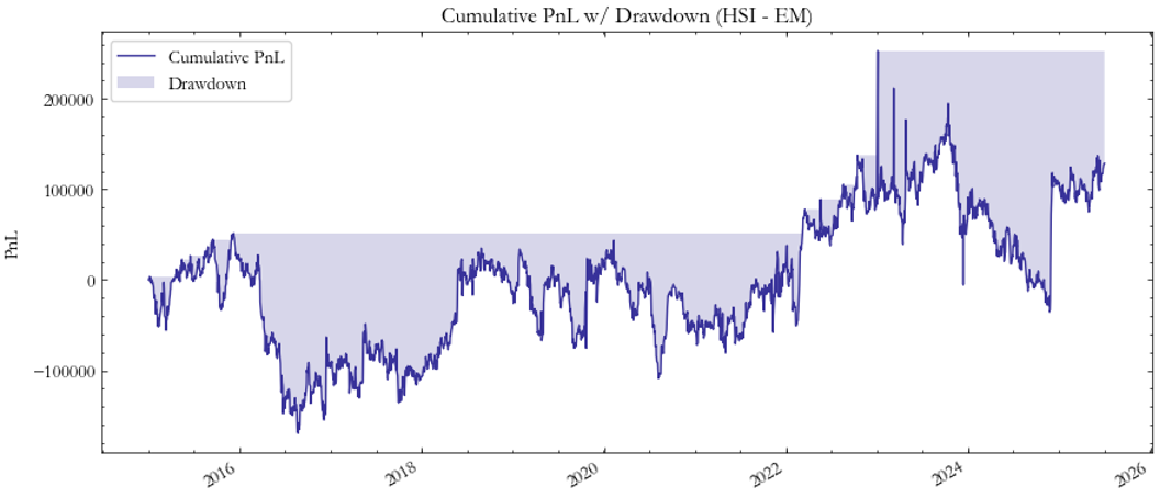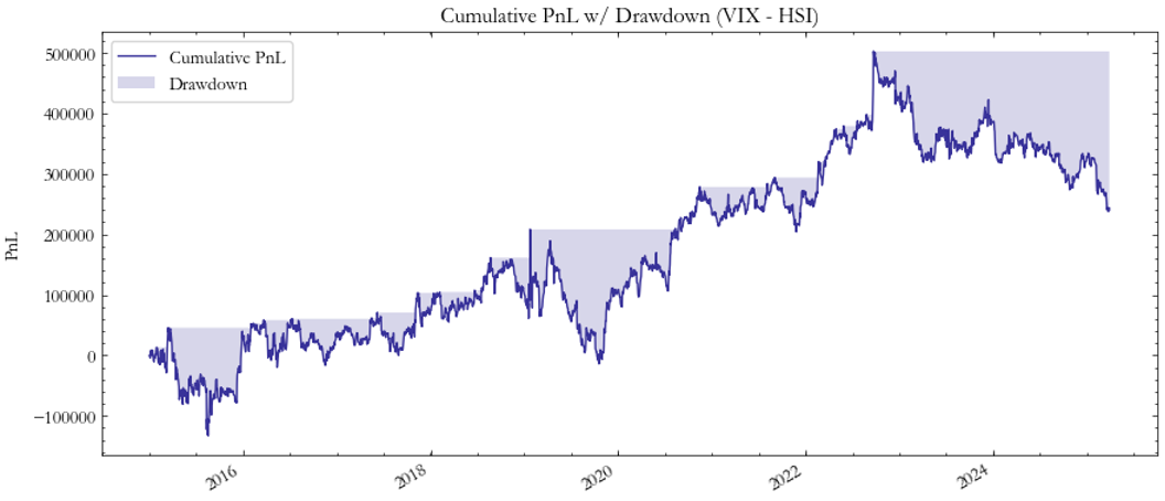 The VIX–VHSI strategy (Fig. 9–10) produced moderate but consistent results. Its Sharpe ratios stay around 0.8, with limited drawdowns and a balanced exposure chart. The smoother performance shown in Fig. 9 highlights the strong co-movement between U.S. and Hong Kong volatility, consistent with global risk-off contagion effects.