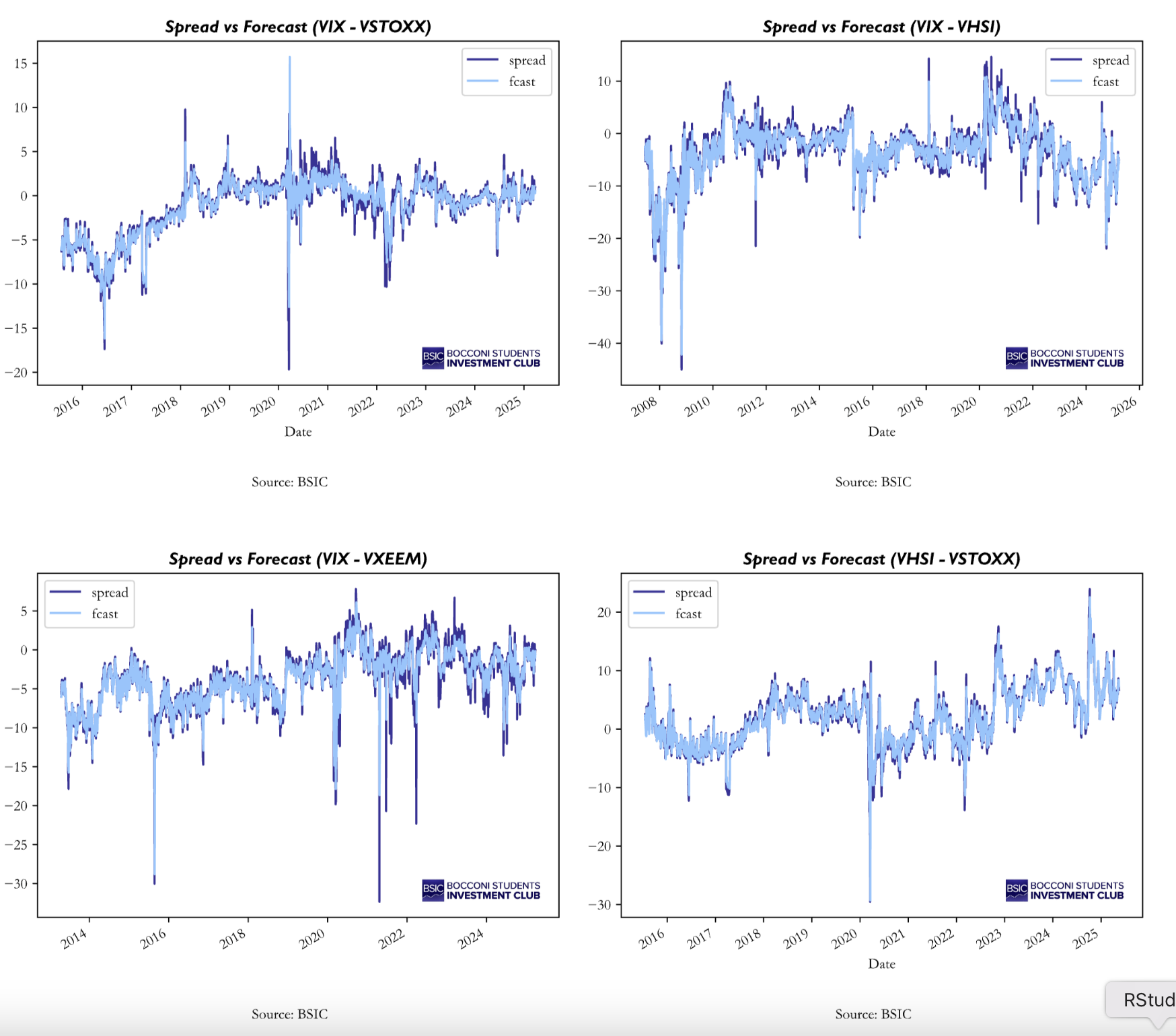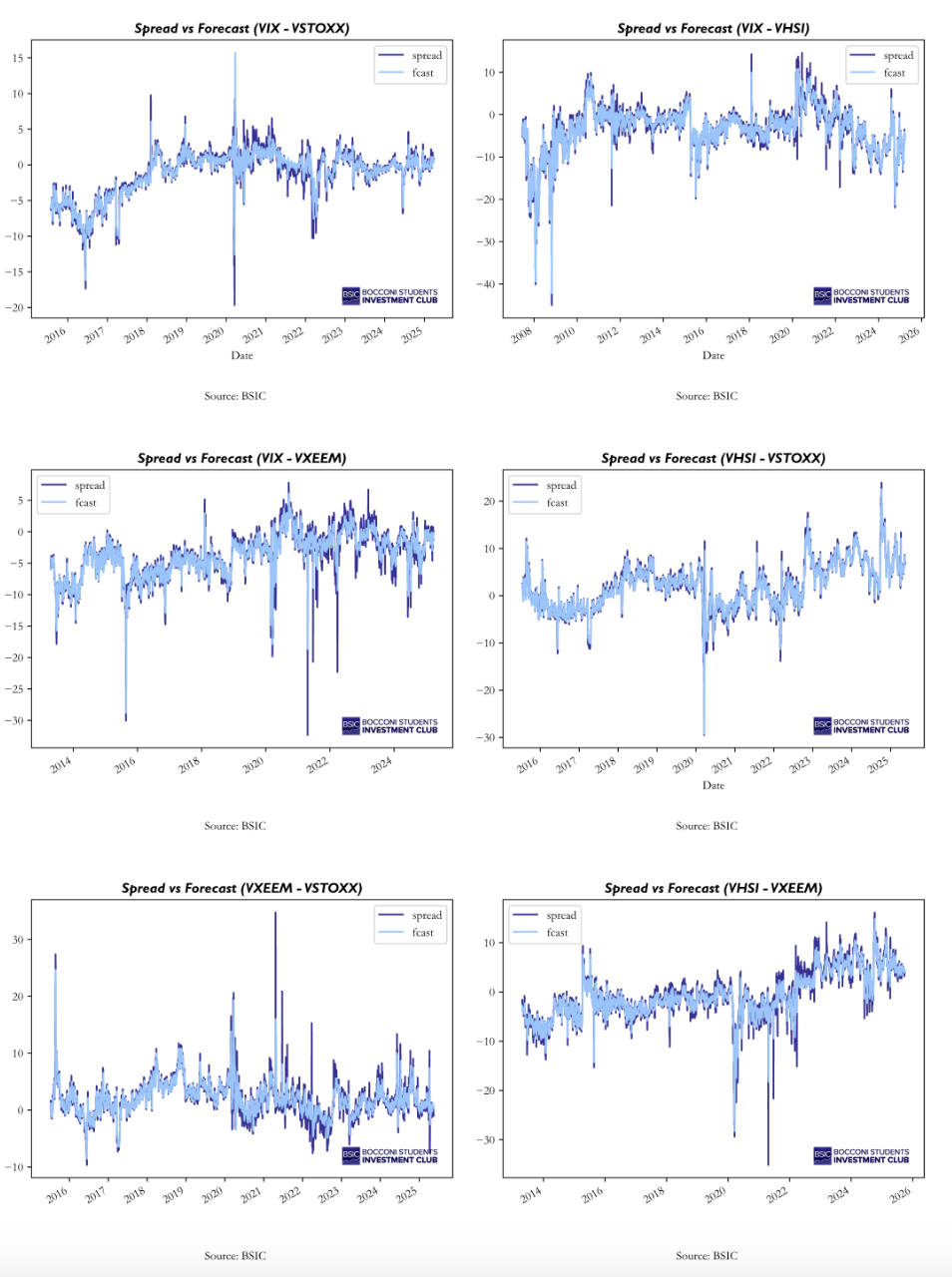 Overall, the AR(4)-GARCH(1, 1) model delivers strong out-of-sample forecasting performance, across all volatility spreads. As shown in the figures, the predictions closely track the actual spreads. From a quantitative point of view, forecast errors, captured by Mean Average Error (MAE), Mean Squared Error (MSE), and Root Mean Squared Error (RMSE) remain low and the explanatory power (R2) of the model is high. In particular, the table show very promising out-of-sample results for VIX_VSTOXX, VIX_VHSI, VHSI_VSTOXX and VHSI_VXEEM, while the worst performing spread is the VXEEM_VSTOXX pair, which show a low R2 (62.63%) compared to the other pairs.