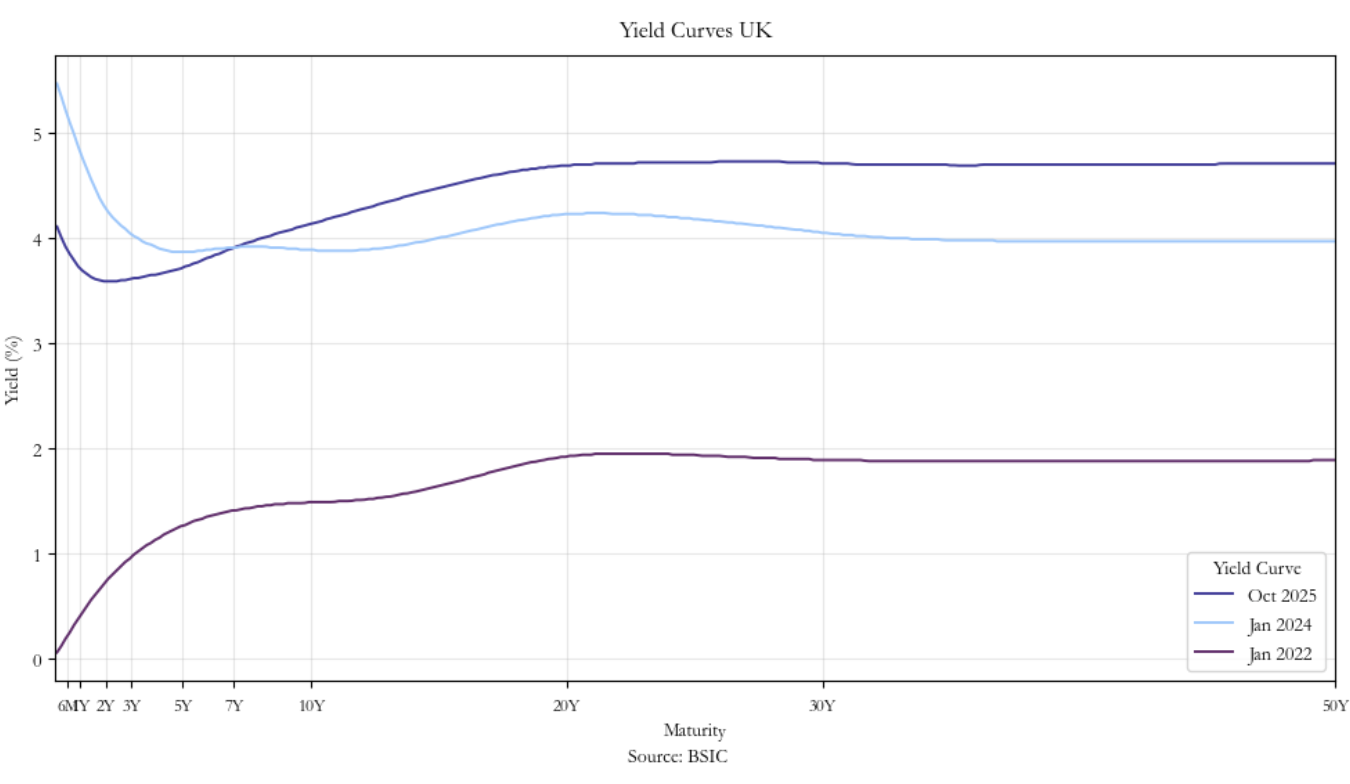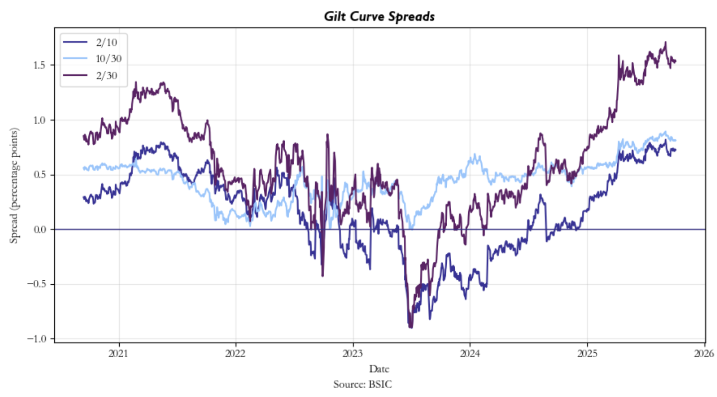 In 2025, renewed volatility and a dramatic reshaping of the yield curve characterized the UK rates market. The year opened with a sharp gilt sell-off, following a global bond rout and weak confidence in the new government’s fiscal direction. In March, the DMO announced a gilt issuance plan of £299.2 bn — below market consensus of ~£304 bn — prompting a brief rally. The 30-year yield fell by up to ~7 bps to ~5.32%, while the 10-year dropped by as much as 6 bps, ending ~2 bps lower at 4.74%. However, this reprieve proved short-lived. In April, U.S. tariff headlines triggered a global risk-off move and a sharp sell-off in long gilts: the 30-year yield spiked to 5.65%, the highest since 1998, while the BoE postponed a long-dated QT auction to ease market stress. The curve steepened sharply (2s near 4%, 10s ~4.8%, 30s mid-5s), underscoring investors’ demand for higher term premia. In July, another notable event shook the gilt market. Chancellor Reeves became visibly emotional during a speech, and after Prime Minister Starmer initially failed to back her publicly, 10-year yields jumped 22 bps to 4.68% — the biggest one-day move since the Truss episode — as markets priced in the possibility of her replacement by a less fiscally conservative chancellor. The following day, Starmer publicly reaffirmed his support for Reeves, gilts rallied, and the 10-year yield fell back toward ~4.5% as panic subsided. Notably, BlackRock, Schroders, and later Fidelity disclosed they had bought gilts into the sell-off, explicitly betting she would remain in government. Following the BoE’s August rate cut to 4%, the front end of the curve became anchored lower, while the long end remained sticky as traders priced in gradual easing alongside persistent supply and fiscal concerns. Overall, the UK yield curve experienced a historic steepening, visible in the chart below.