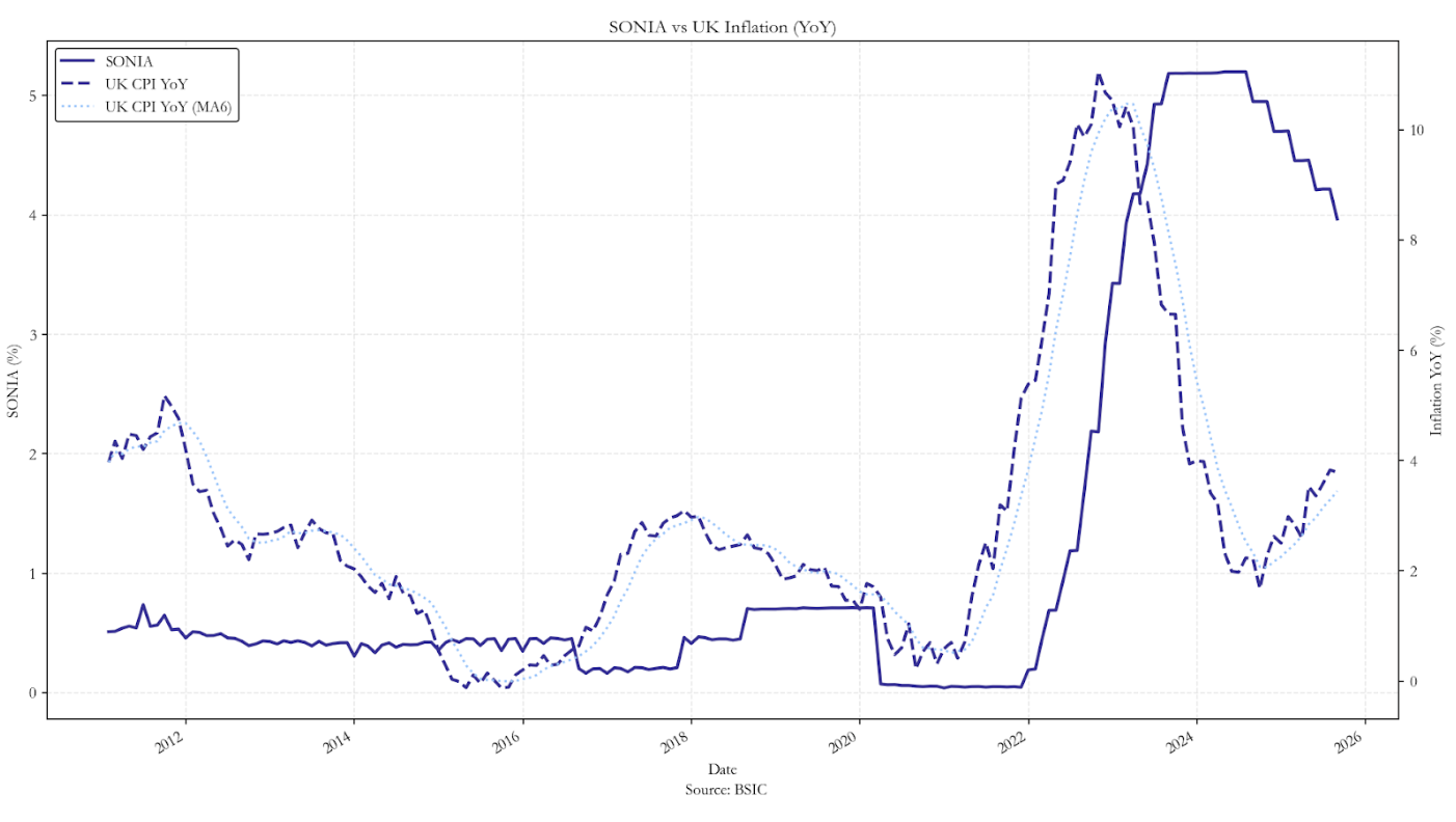 Markets are currently expecting that the interest rate easing cycle will most likely not continue until the start of 2026, with Overnight Interest Rate Swaps (OIS) pricing in only a ~25% change of another rate cut this year. The main reason is that inflation remains persistent, and also has further upside risks which we will discuss later on.